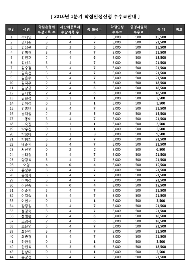 · 학점인정수수료: 1과목(3학점)당 3,000원